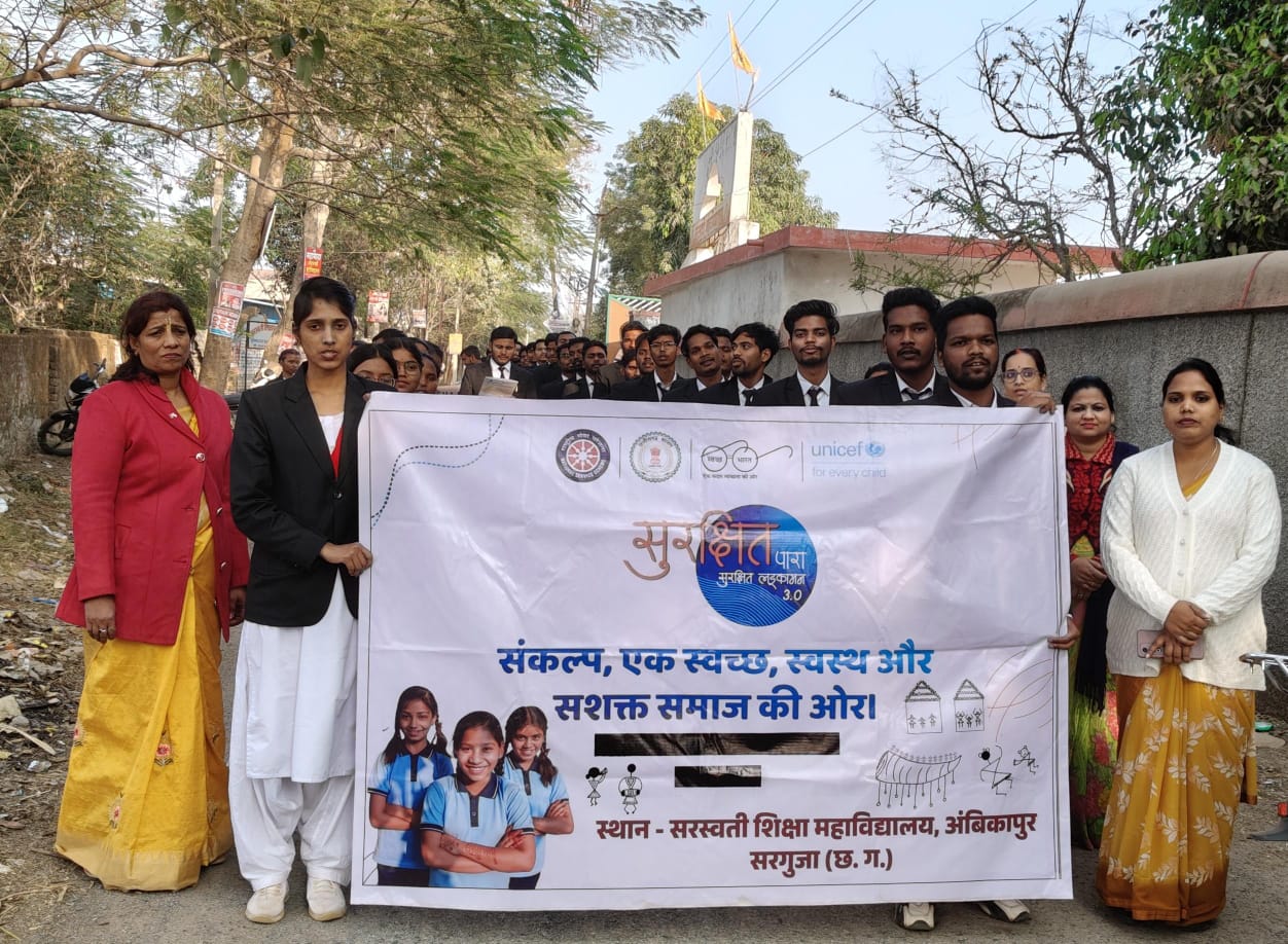 अंबिकापुर। सरस्वती शिक्षा महाविद्यालय सुभाषनगर में आज दिनांक 04 दिसंबर 2025, दिन गुरुवार को राष्ट्रीय सेवा योजना (NSS) इकाई एवंयूनिसेफ छत्तीसगढ़ के संयुक्त तत्वावधान में “सुरक्षित पारा, सुरक्षित लइकामन 3.0 अभियान” के तहत जन–जागरूकता रैली का प्रभावशालीआयोजन किया गया। कार्यक्रम का संचालन महाविद्यालय की प्राचार्य डॉ. श्रद्धा मिश्रा के मार्गदर्शन तथा कार्यक्रम अधिकारी श्रीमती रानी रजक औरसहायक कार्यक्रम अधिकारी सुश्री सीमा बंजारे के नेतृत्व में किया गया।