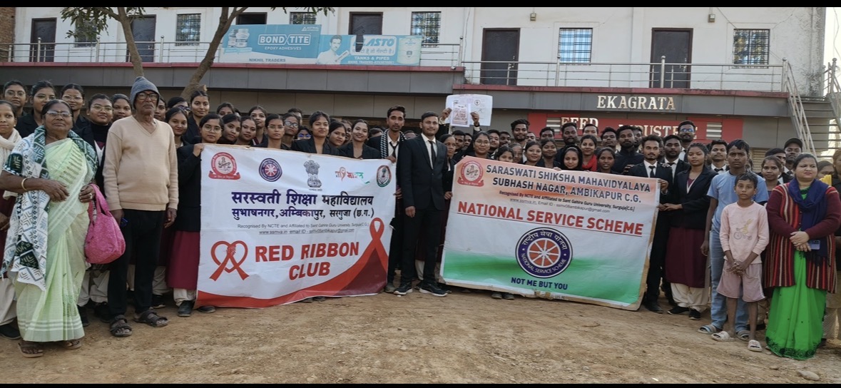 अंबिकापुर/सरगुजा। सरस्वती शिक्षा महाविद्यालय, सुभाष नगर में रेड रिबन क्लब इकाई के अंतर्गत 1 दिसंबर से 6 दिसंबर 2025 तक एड्सजागरूकता सप्ताह का आयोजन किया जा रहा है। संस्था की प्राचार्य डॉ. श्रद्धा मिश्रा के मार्गदर्शन, कार्यक्रम अधिकारी (रा.से.यो.) श्रीमती रानीरजक और रेड रिबन क्लब प्रभारी सुश्री सविता यादव के नेतृत्व में विभिन्न जागरूकता गतिविधियों का संचालन किया जा रहा है। 05 दिसंबर कोआयोजित मुख्य कार्यक्रम के तहत बी.एड प्रथम वर्ष के प्रशिक्षणार्थियों ने महाविद्यालय परिसर से सुभाषनगर चौक तक जागरूकता रैली निकाली।रैली के बाद चौक में पहुँचकर विद्यार्थियों ने आकर्षक और संदेशप्रधान एड्स जागरूकता फ्लैश मॉब प्रस्तुत किया, जिसने राहगीरों और आम जनताका ध्यान अपनी ओर खींचा।